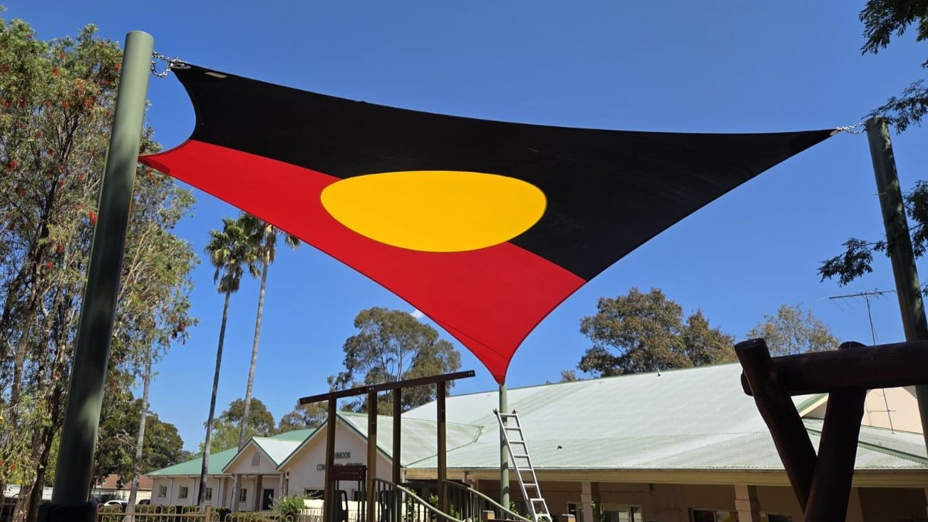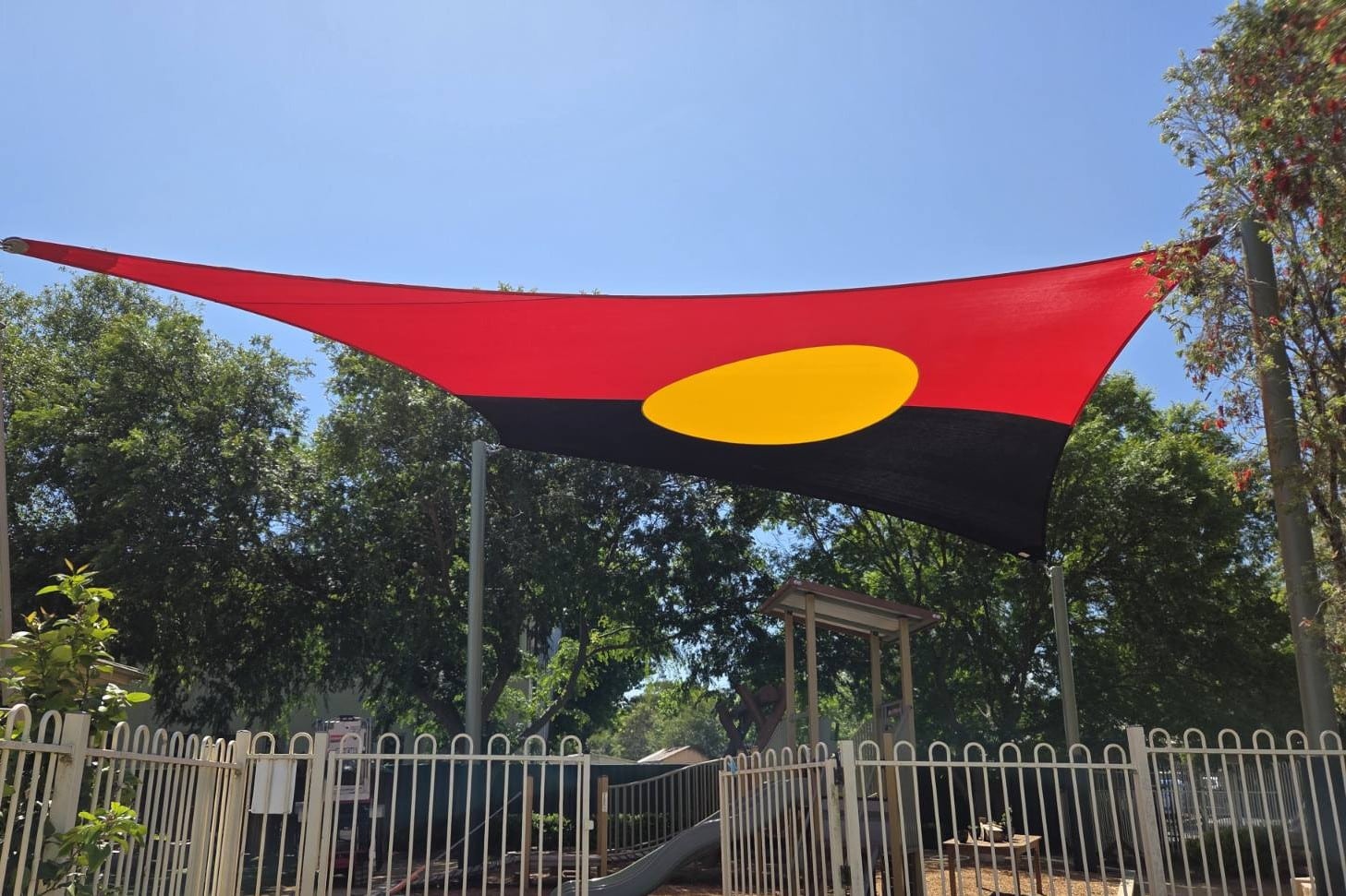 A much needed shade was required at the Rainbow Playhouse Pre School over their existing playground space. After getting the style and shape right for the area, the centre was keen on being able to incorporate an Aboriginal flag design to the sail. And of course we said yes! We can do that! The finished sail is a spectacular vision!