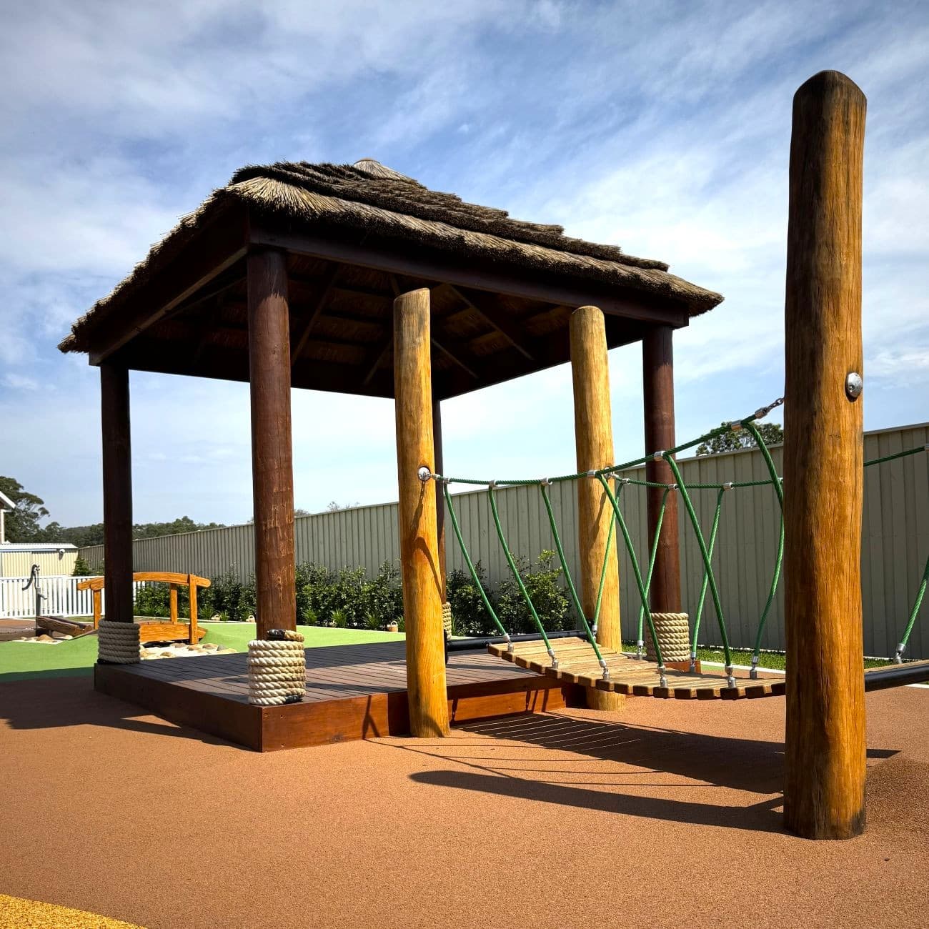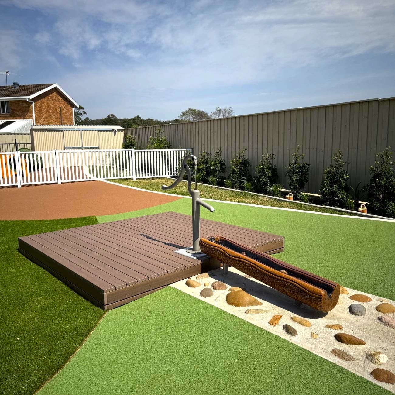 Works at the fabulous new Horsley Kids Early Childhood Centre have now been completed and it's been an honour to be a part of this spectacular new site! All timber products were used to give a natural feel and a custom mod wood deck with water pump and dry creek bed are the central feature. A combination of surfaces were used to complete the project with 30mm Summer Prestige Synthetic Grass, TPV rubber discover pathway and CSBR/SBR mix surrounds.