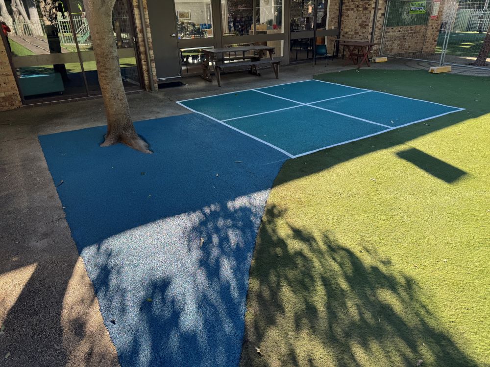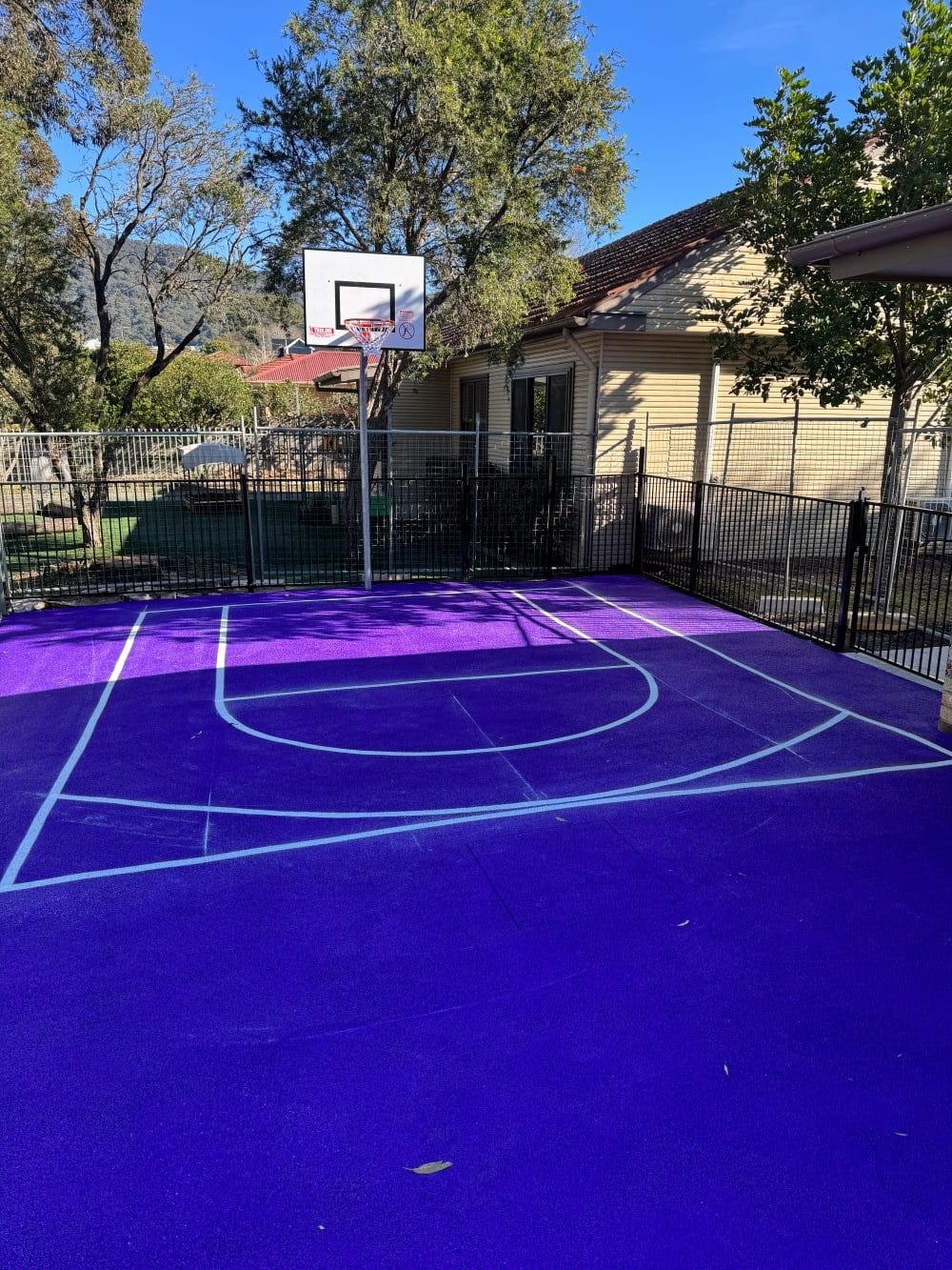 Two areas were worked on within Yennora Public School. The first area in their special needs unit required new equipment, rubber surfacing, sandpit and shade. The second area was their old asphalt basketball court that was transformed using CSBR Pre Colour Rubber Wetpour Surfacing creating a bright, fun and usable space for the children.