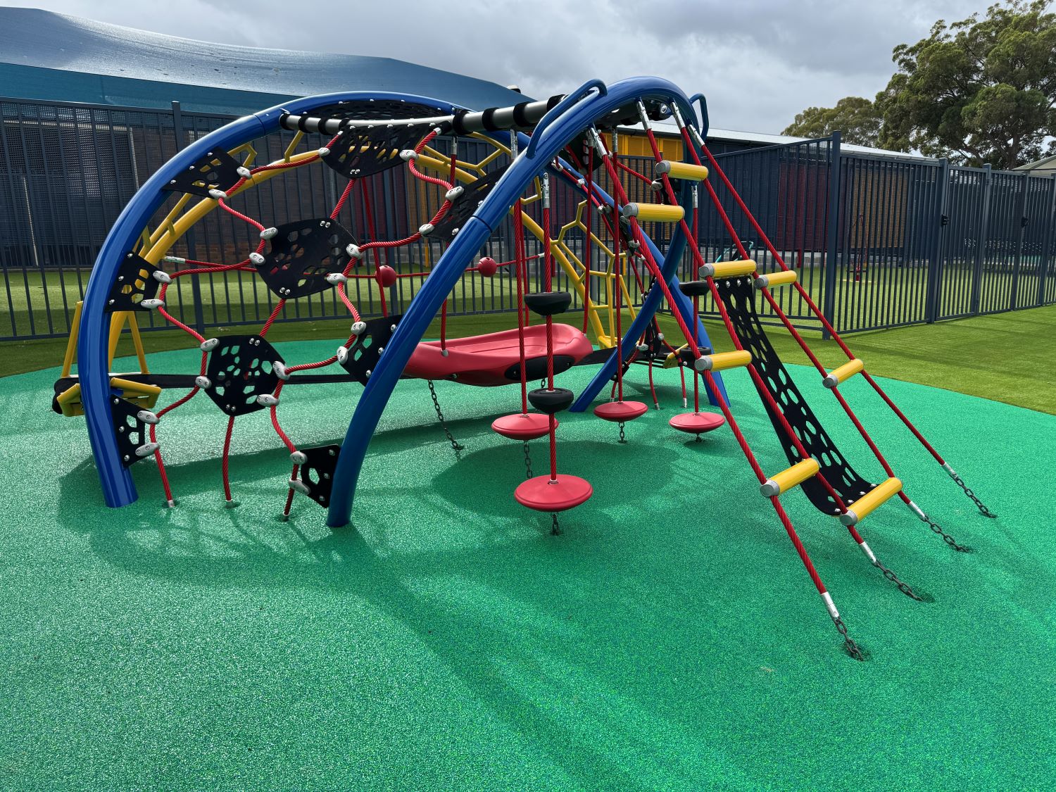 A Support Unit with equipment and activities specifically chosen to suit the needs of the children has seen this unused area develop into a functional play space. Boasting lots of equipment from Sensory Play Centre walls to a Geoplex Climber and large Omnispin Spinner amongst others, coupled with a much needed shade structure and Rubber Surfacing to finish off the area with some ball game line markings.