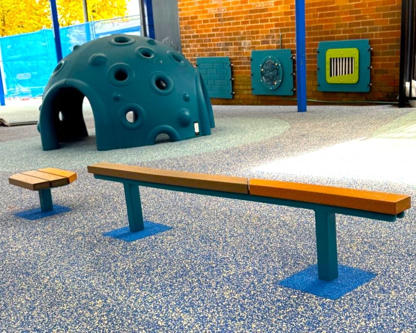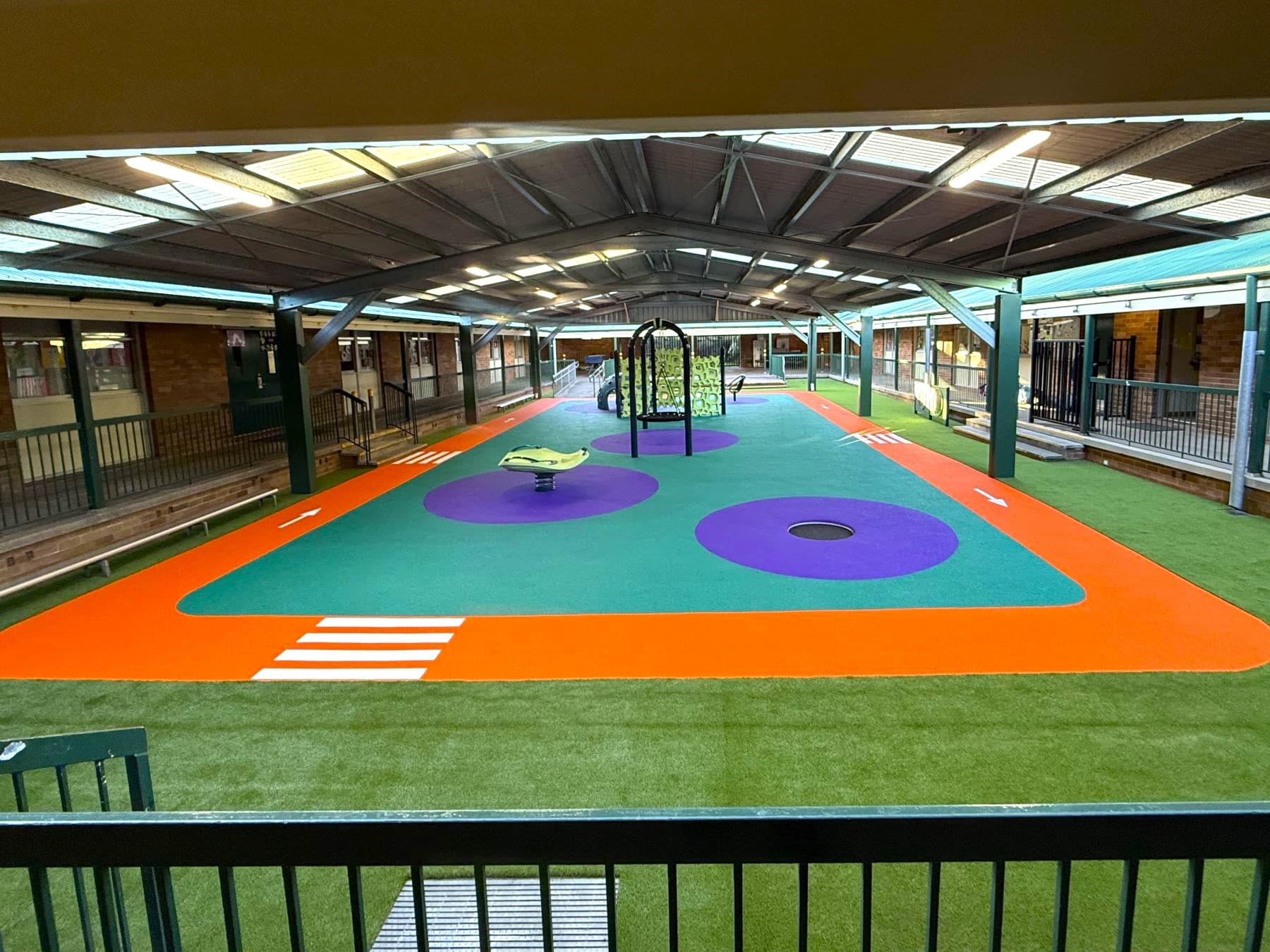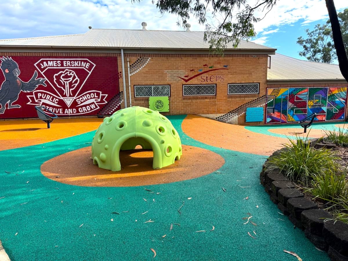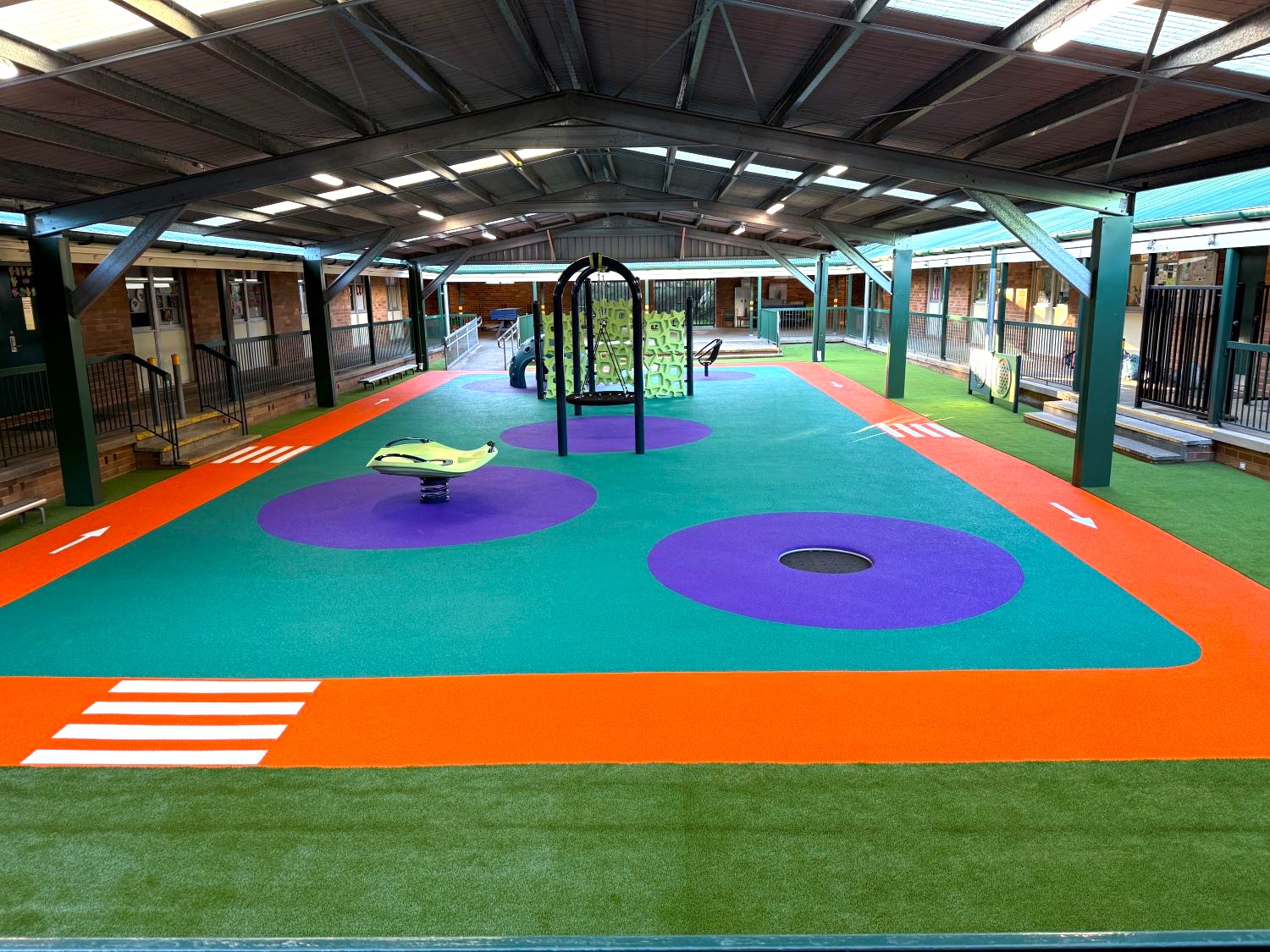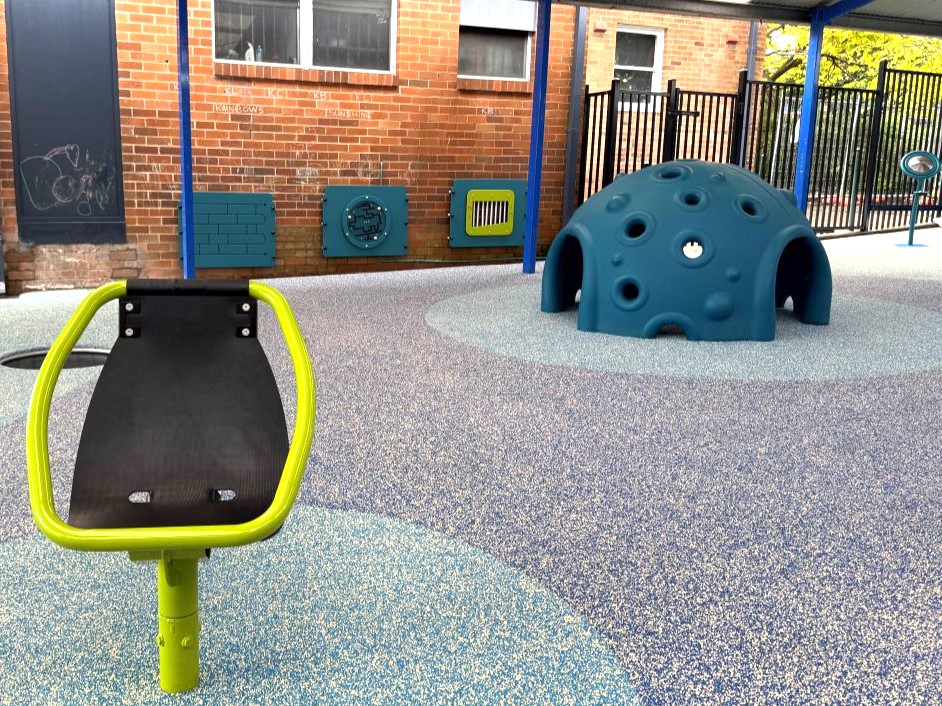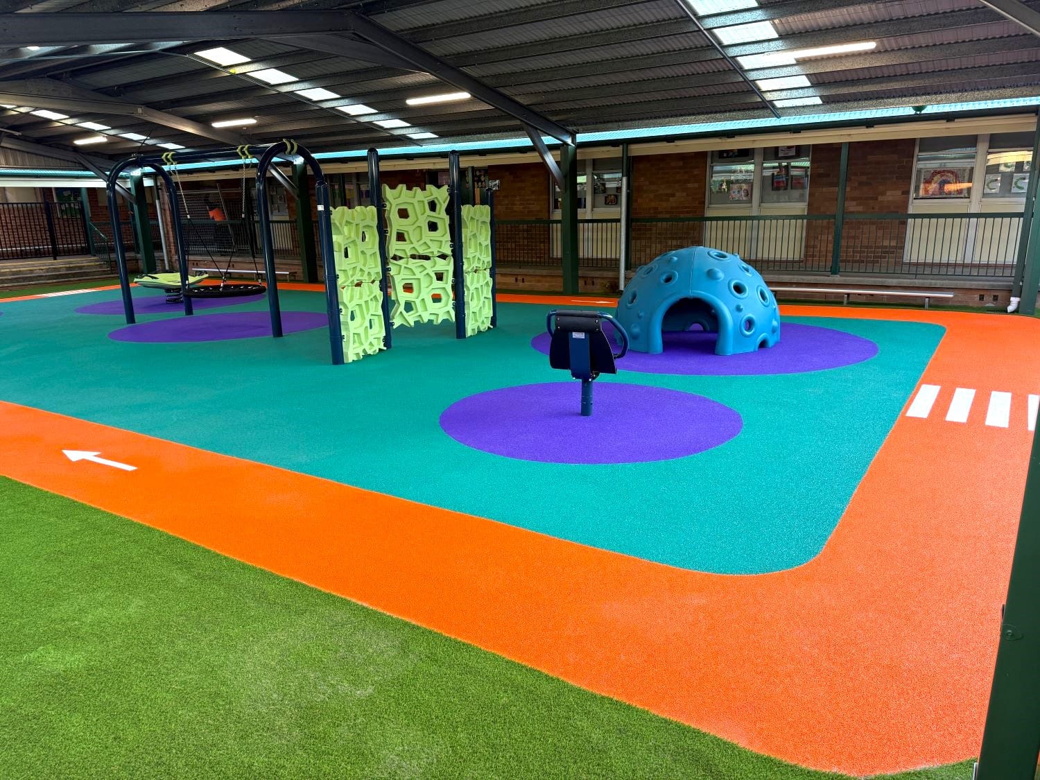 Sometimes the simplest of things can make a big impact and this couldn’t be more true of the works completed for James Erskine Public School. An unused space in the school has been transformed into an earthy sensory space for their Support Unit with Cozy Dome, Chill Spinners, Sensory Play Panels, Inground Trampoline and all finished off with EPDM Rubber Surfacing.