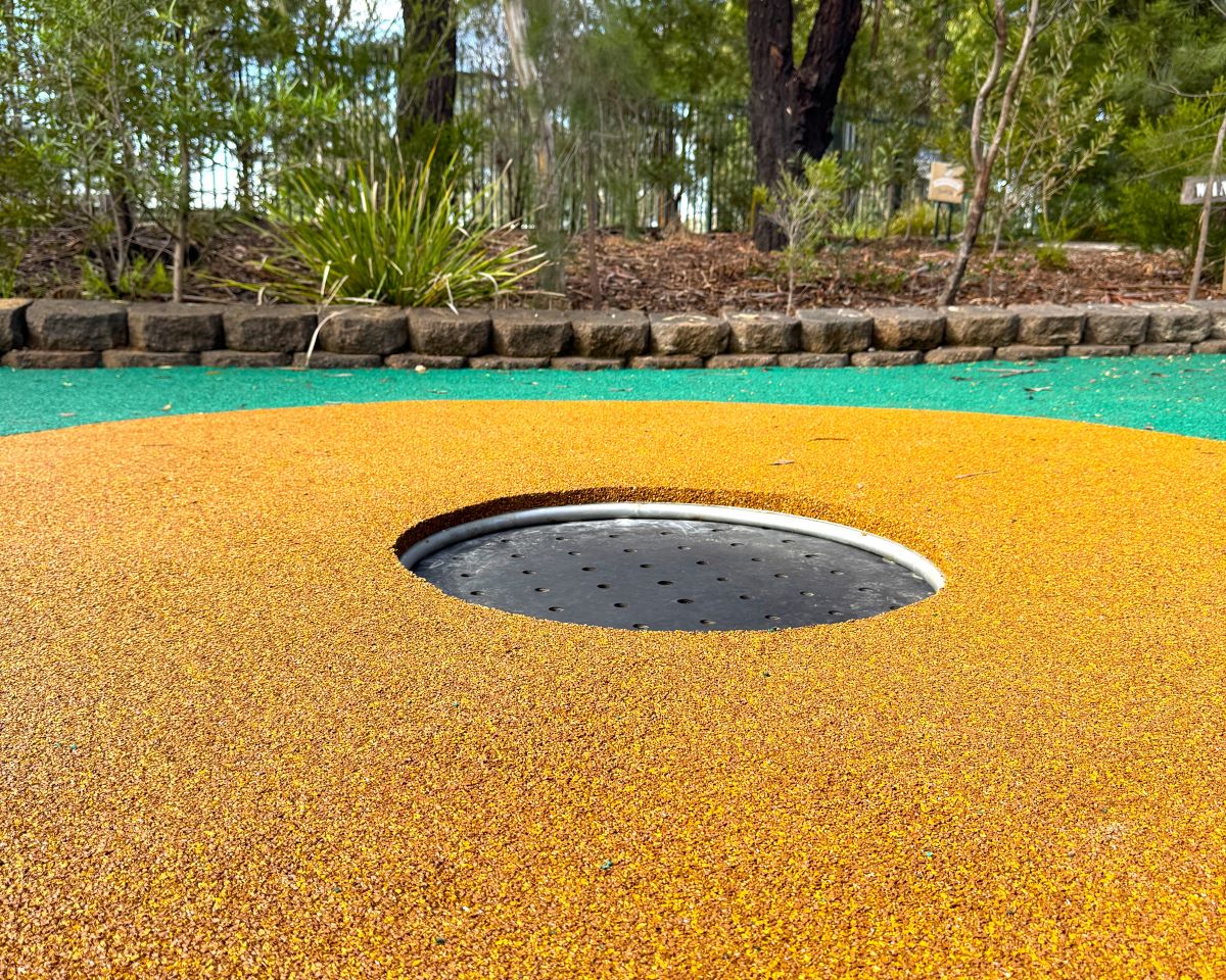 Rubber Wetpour Surfacing is a great system to use to create something out of nothing and this certainly shows at Braddock Public School. We had two outdoor spaces to work on here with one yard being the main focus to create a bike track with pedestrian markings, sensory panels and sensory equipment including wall panels, rubber crocodile, Chill Spinner and an inground trampoline.