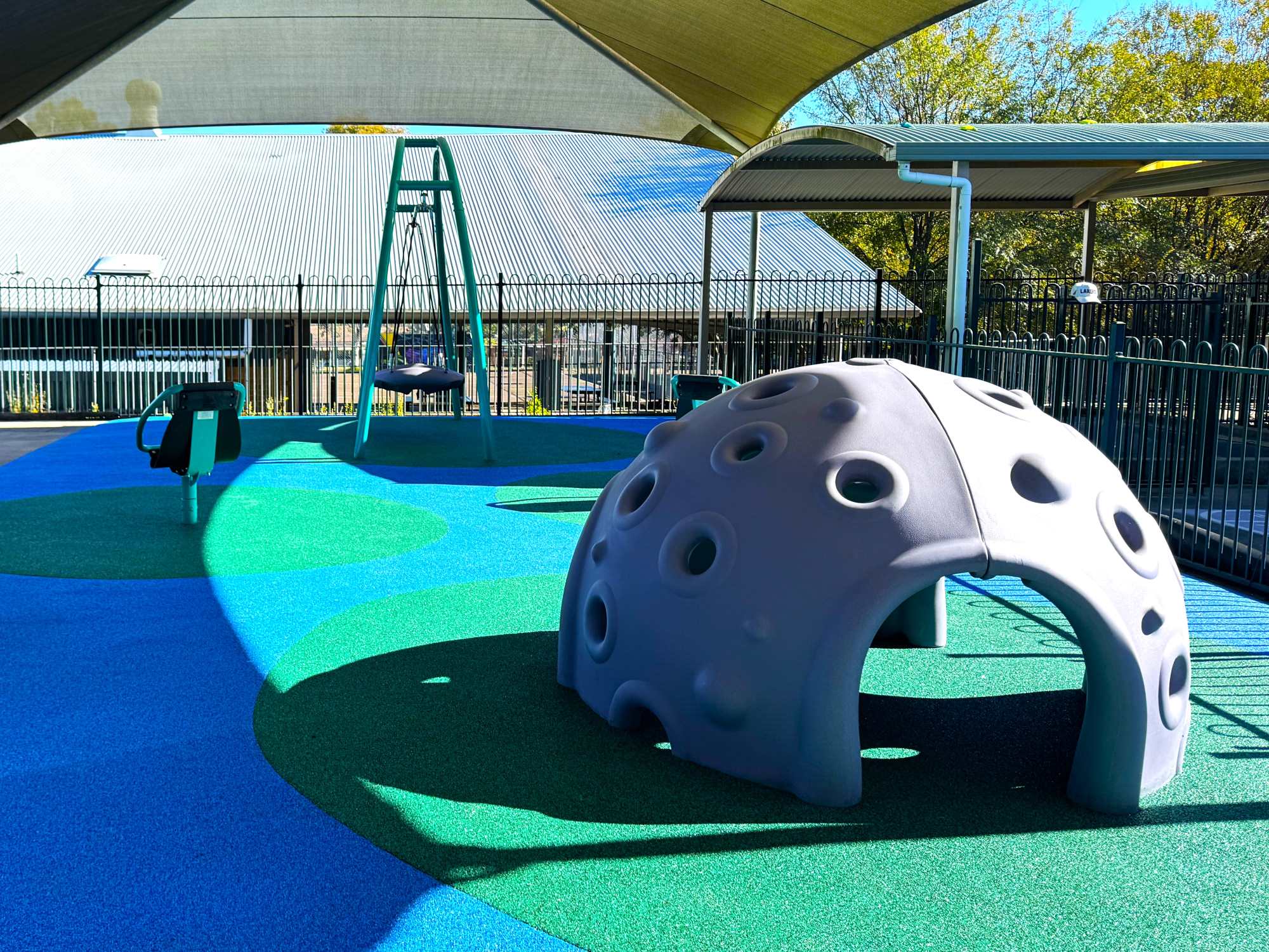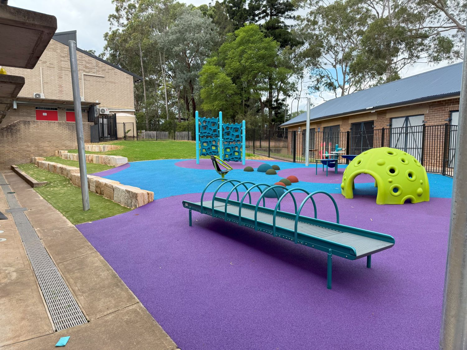 From drab to fab! The introduction of free standing pieces specifically targeted to the needs of students in Northmead Public School’s Support Unit, has transformed this grey old COLA area to a fun and inviting play space. Design includes a Cozy dome, Chill Spinner, Inground Trampoline, Geoplex Climber, Rhapsody Music, Sensory Panels and Forma Balance Beam. All finished with EPDM surfacing, we have packed lots into this design!