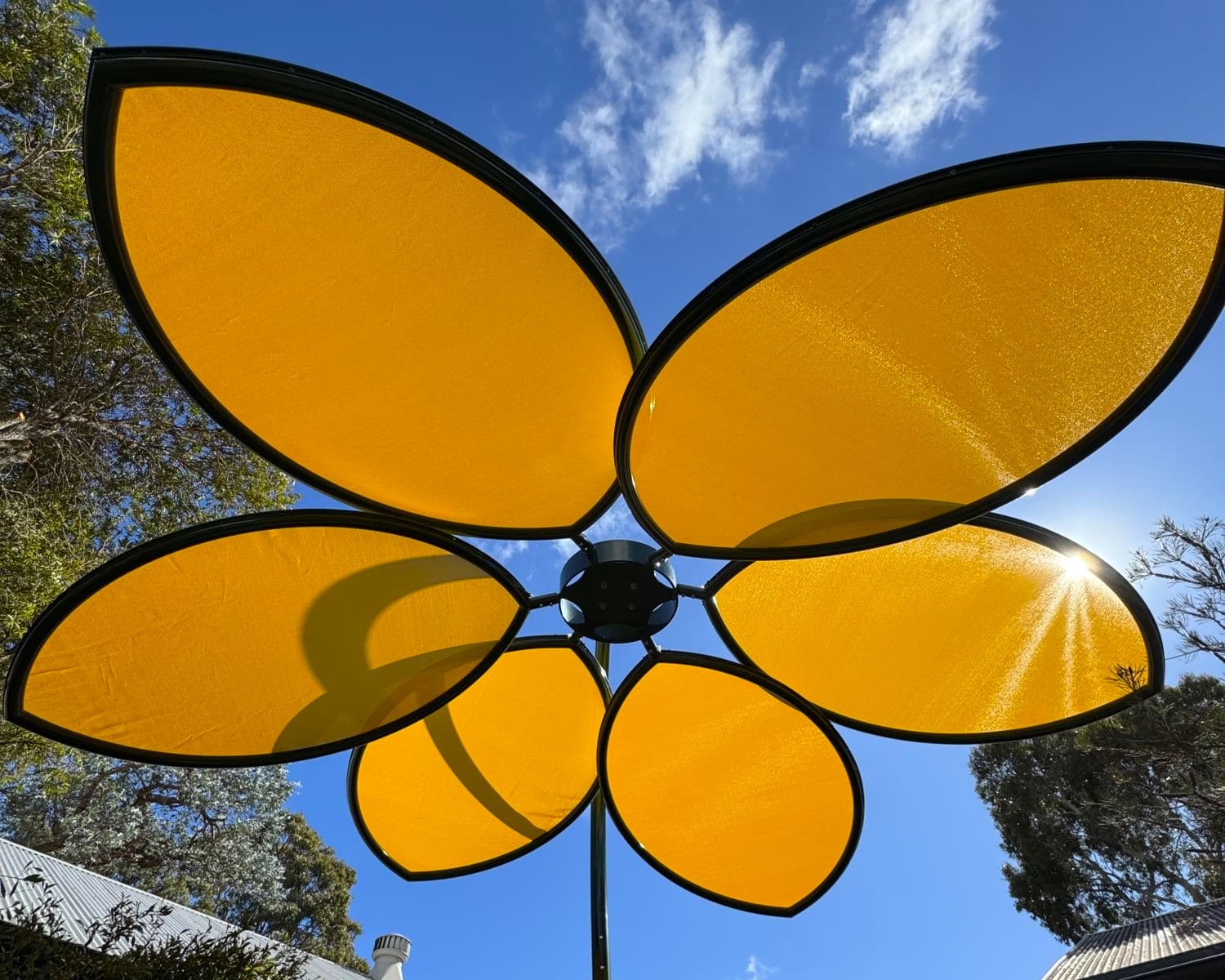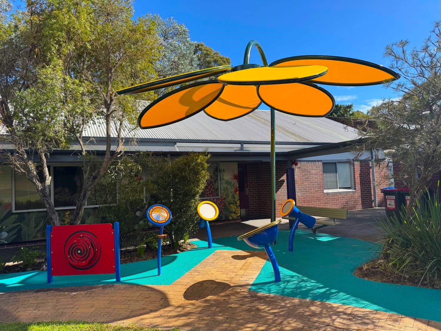 Two customised Flower Shaped Umbrella shades over a sensory play area complete with rubber wetpour surfacing to create a secret garden pathway through garden beds with sensory panels along the way and a larger outdoor musical play area.