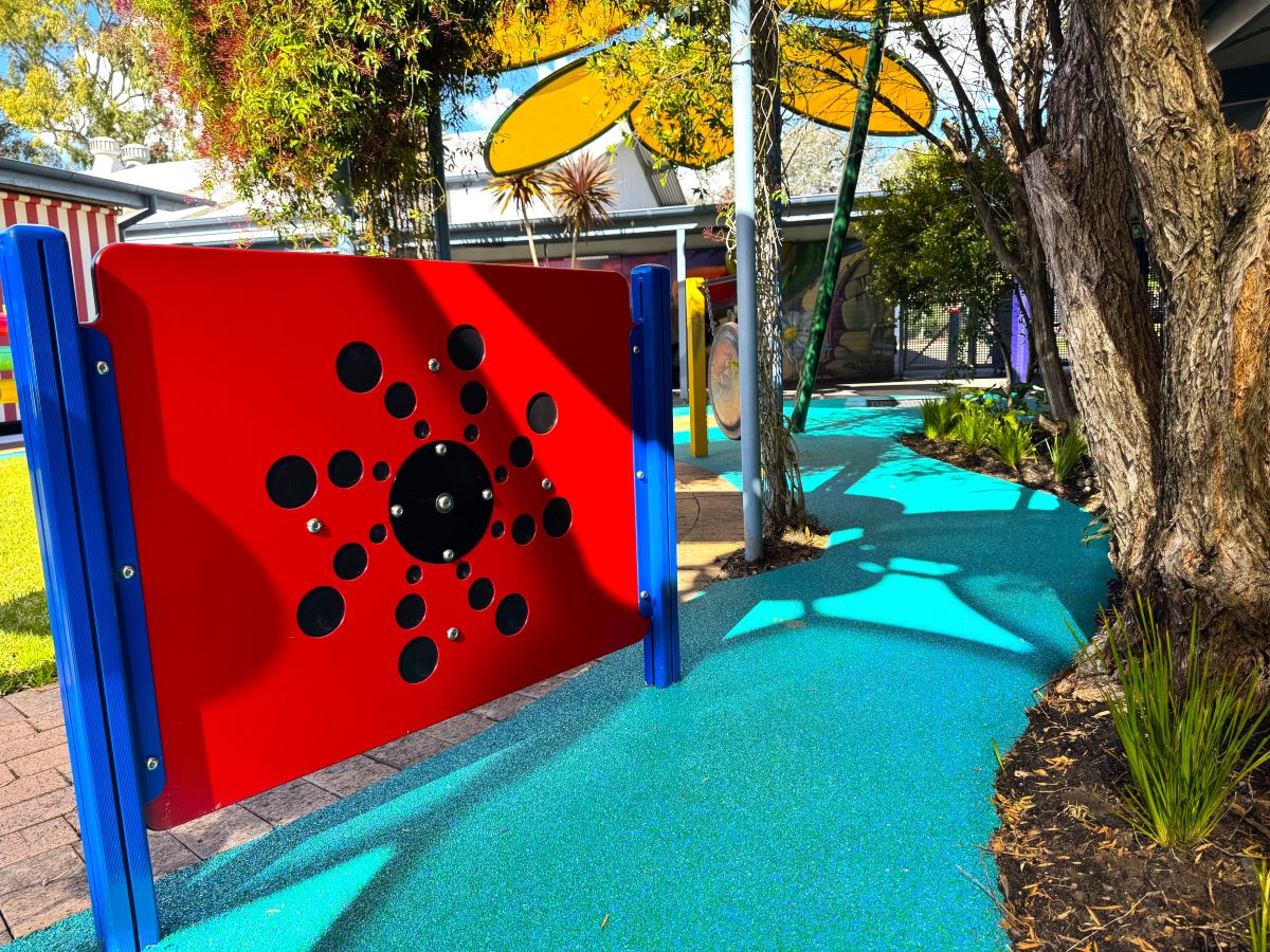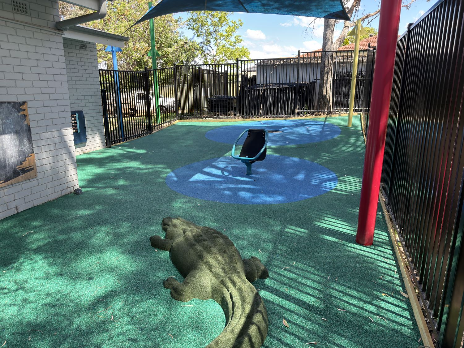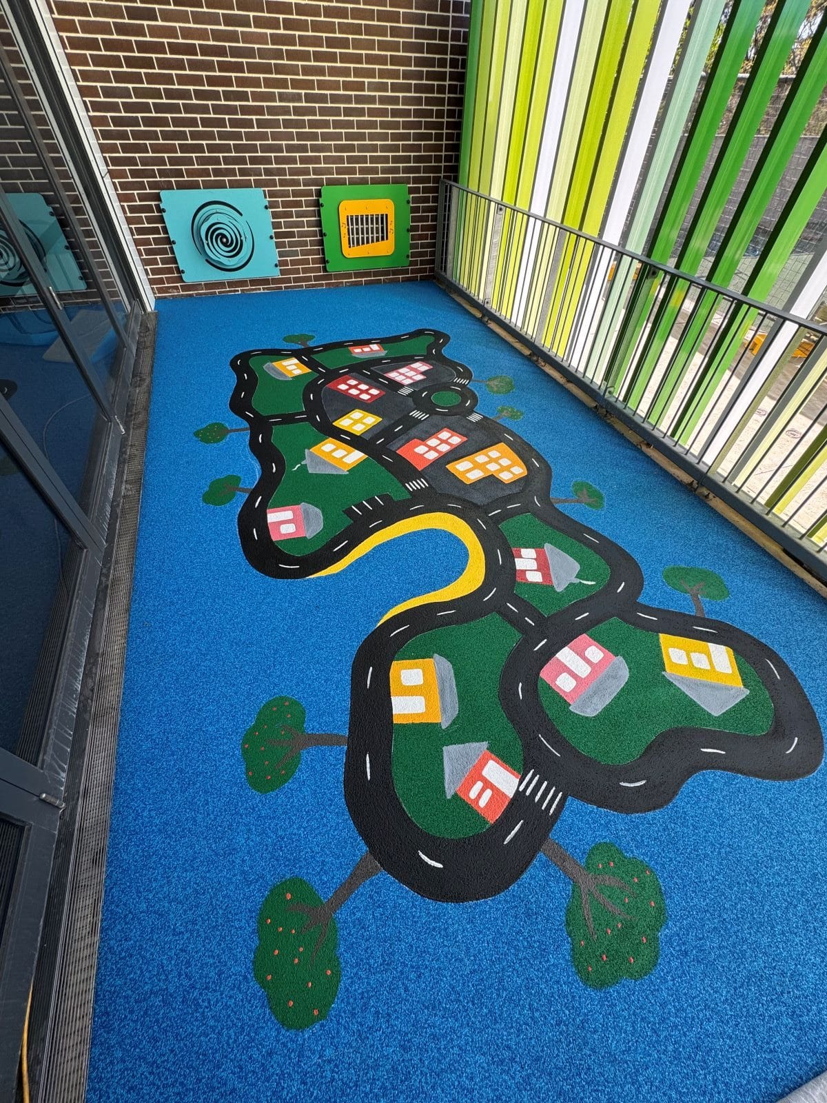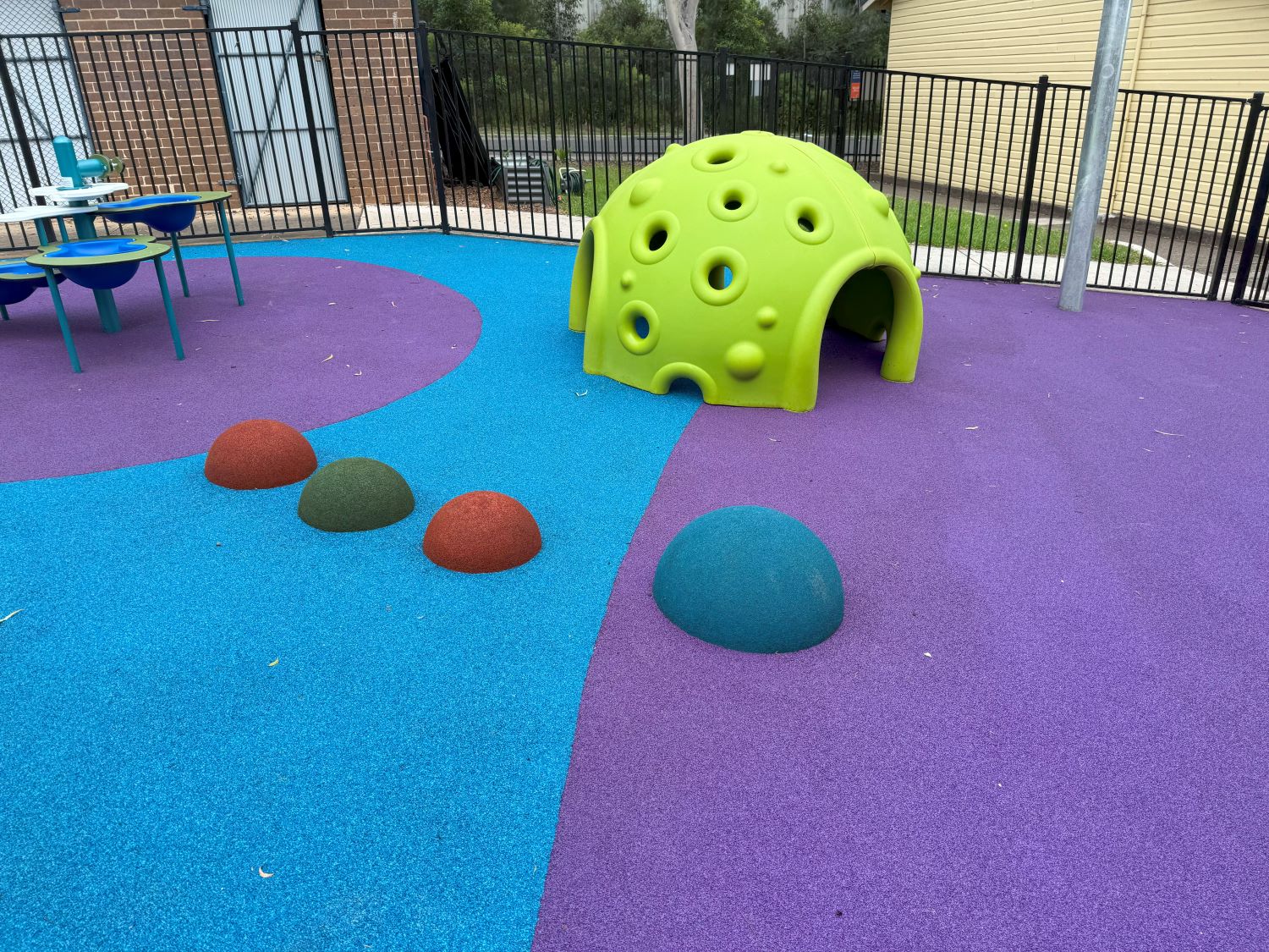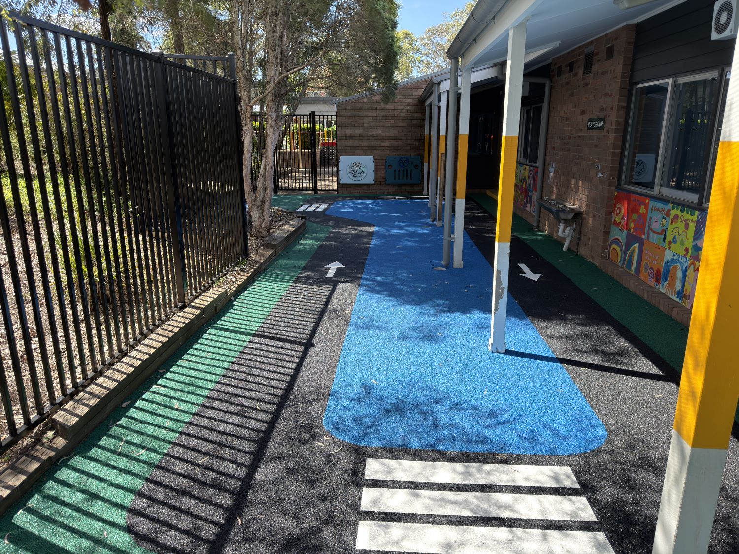 Two areas were required at Bankstown North. The first was an embankment area that had a very dangerous stainless steel slide and steep grade that needed to be rectified. We did this by removing the old slide and introducing a new tunnel slide. With the use of Sandstone logs and rubber surfacing, we regraded the area and made it safe for the kids to use. The second area was an outdoor support unit area that was small but needed something interesting for the kids to engage in. Their main item on their wish list was a car track for the small toy cars. A fabulous graphic was painted on the rubber surfacing and new sensory panels installed on the walls.