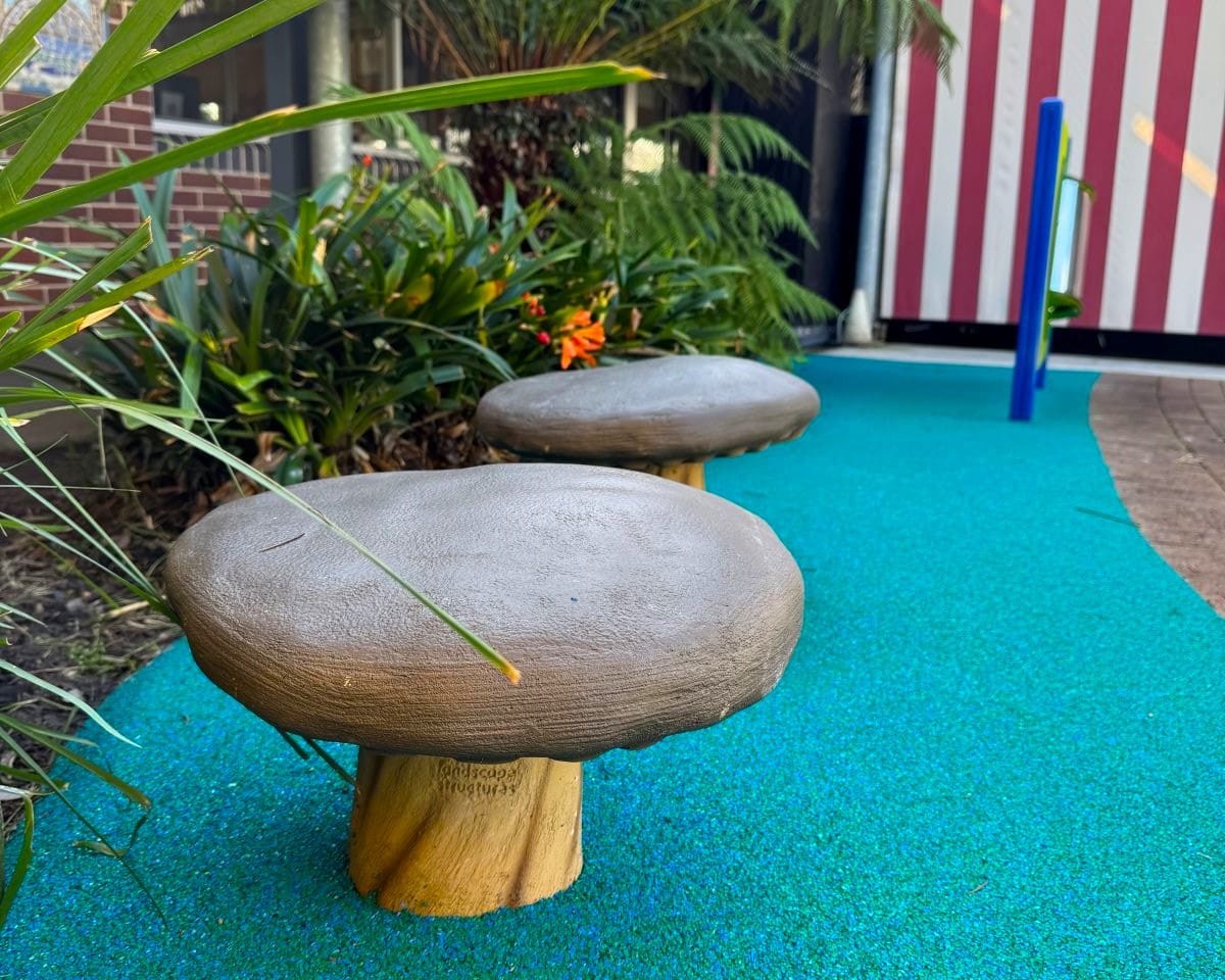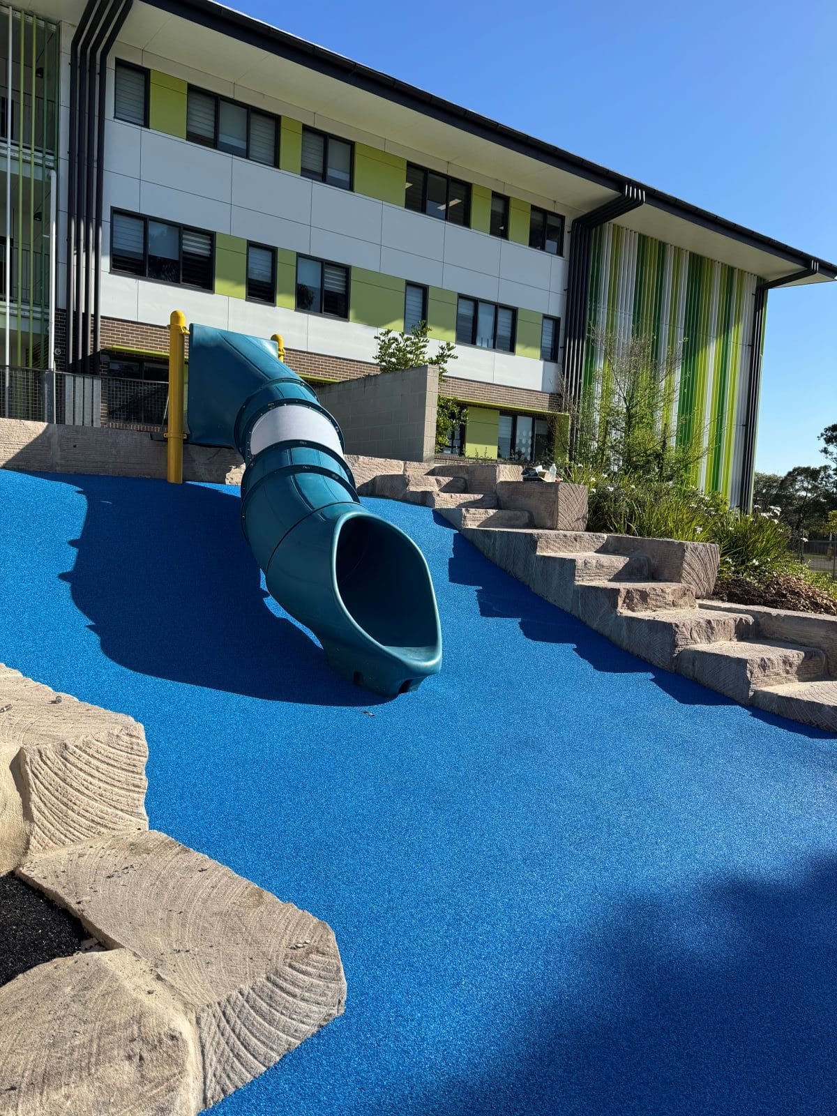 Parramatta West Public School needed more than just a play area, there was a steep dangerous hill that needed to be tamed to allow the kids to play safely. With the introduction of sandstone logs, we created tiers for the kids to be able to sit and enjoy their lunch with synthetic grass in between the layers. Then a play space was created with multiple free standing elements including a Roller Table, Cozy Dome, Chill Spinner, Geoplex Climbing Wall and a Splash Circuit Table. The Rubber Surfacing brightened up the area and some additional Rubber Half Spheres were included to create a safe balance challenge. All finished off with a Hypar Sail Shade Structure over.