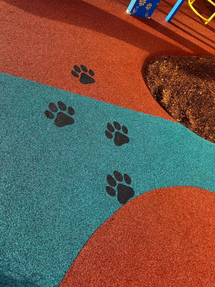 With an old bark mulch pit that was overgrown with grass and weeds, this old playground wasn't a very inviting place to play. It has been given a new lease on life with a rubber wetpour border using CSBR Pre Colour Rubber Wetpour in the school's colours and to add a bit of fun, some little paw prints for the children to imagine what creatures may have visited their playground through the night!