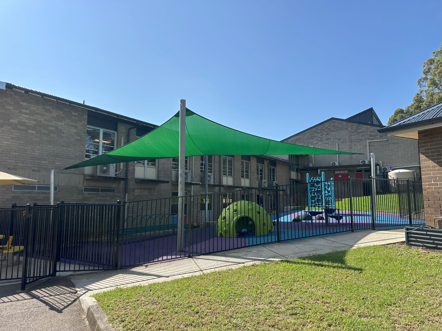 A tight little area required an out of the box design! This outdoor fitness area at William Rose School was a hot box and the equipment was not able to be used on days of extreme heat. But the tight space made a standard shade difficult. This Cantilever structure did the trick and with it's bright Emerald Green Shade cloth, the kids now have a cool place for their daily exercise. It also helped with the classroom temperature, protecting it from the harsh sun also.