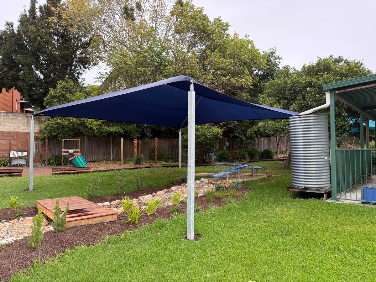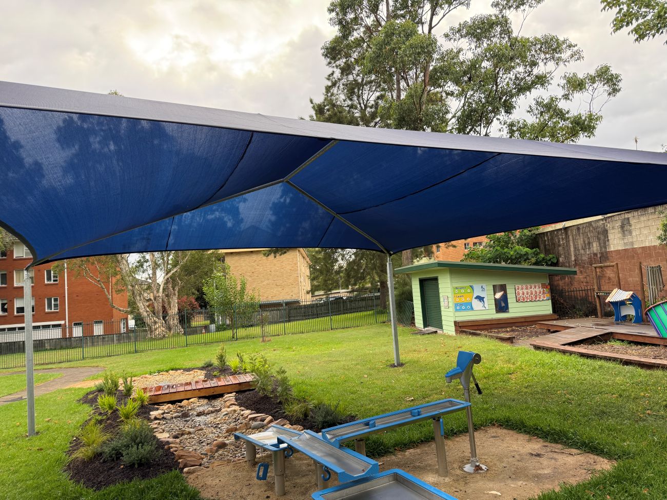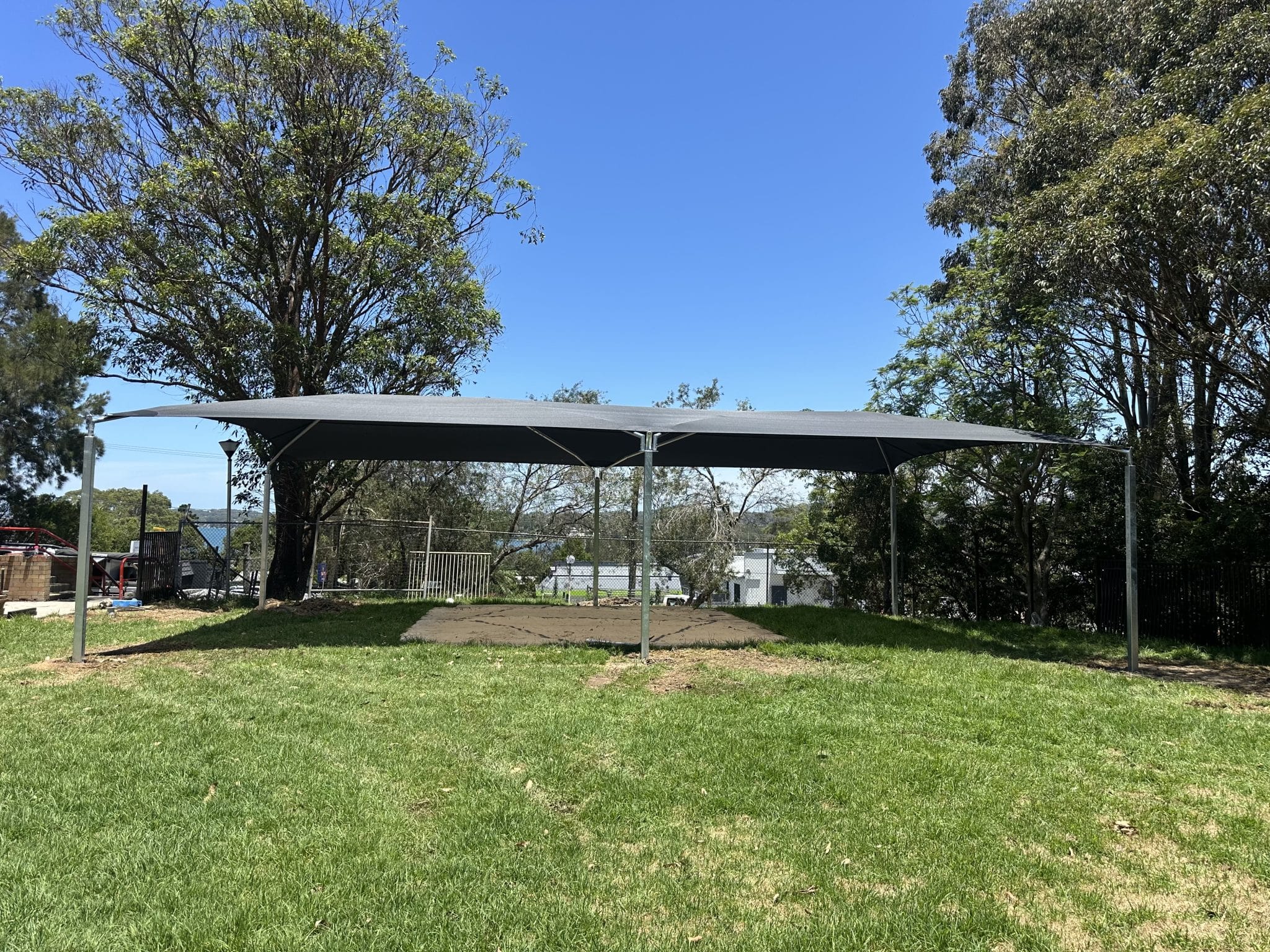 Working with McMahon Building Services, we provided a new shade structure over the sandpit area they had created. To create the span we used a double Hip Roof Shade structure using 6 posts and one complete shade cloth to maximise the shade coverage across the space.